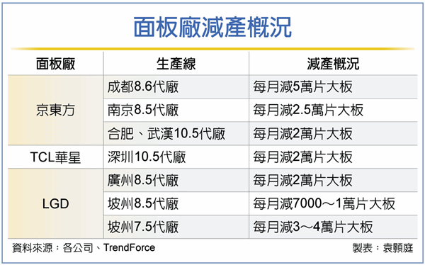 面板廠罕見地快速反應,立刻減產救市。部分面板廠減產高達兩位數的幅度,隨著面板廠快速調節產能,第四季面板價格跌勢可望逐月收斂。此次減產還是由中國面板廠率先發動,要及早減產救市的意味相當濃厚。