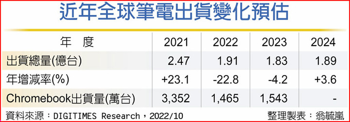 DIGITIMES Research則預估,疫情間先趨於飽和的教育市場,明年即可望迎來換機潮,並激勵Chromebook率先反彈,較今年增長5%以上、回升至逾1,500萬台。品牌廠中,甫於今年第三季重返全球Chromebook市占龍頭的宏碁,則可望在持續掌握教育訂單,及擴大商用Chrome OS機款產品線出貨的帶動下,為其明年度筆電出貨挹注較產業逆勢增長的動能、年增至少1%。