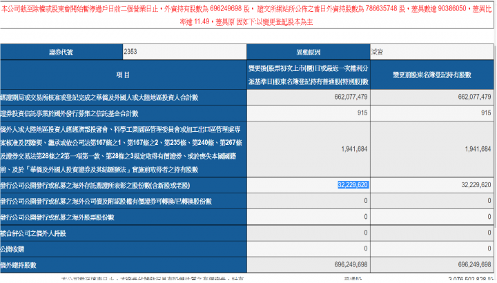 neonjuly wrote:先感謝 Acer_kewei...(恕刪) 外資就申報議動,股票就減少了~~106年09月11日 外資及陸資投資持股統計http://www.twse.com.tw/zh/page/trading/fund/MI_QFIIS.html自行輸入 2353,106年,上面有議動的原因~http://mops.twse.com.tw/mops/web/t98sb02感謝上次版友提供的資訊~~###########################################################今天有版友升級為千張大戶了~~就是我和大家說的,小超級大戶~~他對這樣封號很有興趣~~他自已的定義"小超級大戶=奈米戶"~所以他常常以奈米戶自稱,最近常常發言,提示就只能這麼多了~~