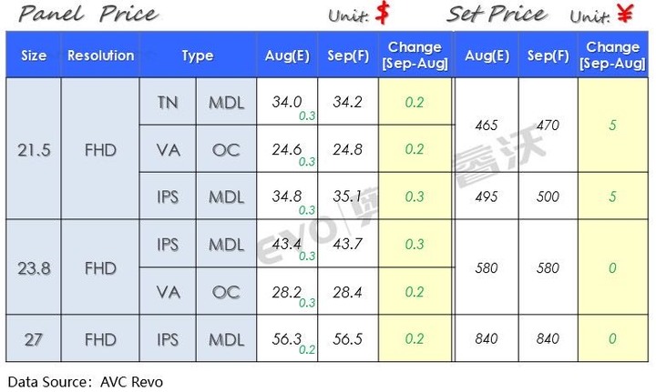 21.5”FHD :TN MDL價格8月預計漲0.3美金;VA OC價格8月預計漲0.3美金。