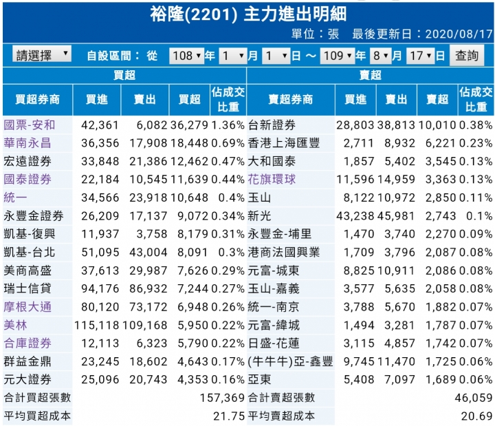 裕隆 (2201)籌碼相關-富邦 券商分點個股進出