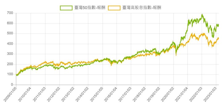 我自己認為盤整的時候高股息和大盤指數差不多。但走多頭時大盤會大幅領先。理論上買大盤會是比較好的選擇。