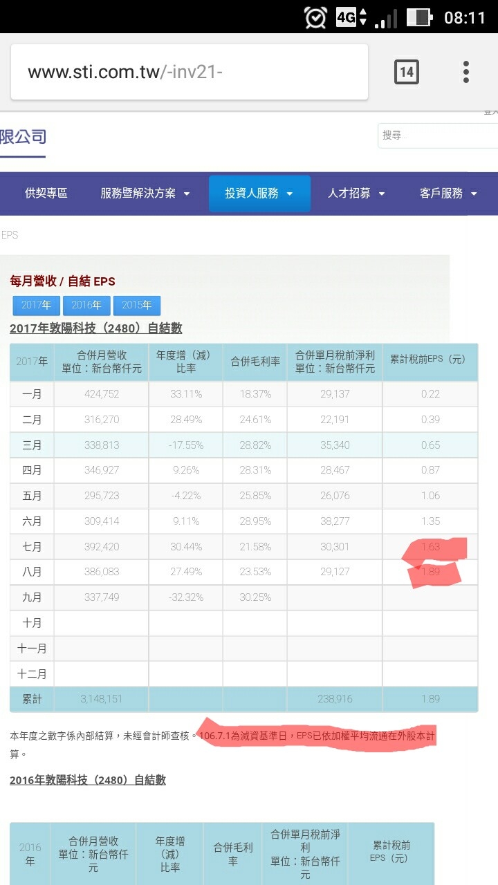 前八月稅前都賺 2.25元了, 怎麼可能前9月變2.22元.但又不像用減資前股本計算, 怪怪的.自己算應該賺 2.4 才對, 以今天 34.15收盤價計算預估本益比是 8.明天不管下降趨勢會買進.敦陽(2480)1-9月每股稅前賺2.22元,優於去年同期,Q4營收將持續成長盈餘:敦陽(2480)累計1-8月合併稅前獲利2億3891萬元,每股稅前淨利2.25元仔細看新聞應該是記者親公兜親母,把月獲利放在累進獲利的尾數(3647是9月獲利,卻將36469當作前9月獲利)。真正的前三季稅前eps= 2.588,本益比約9.8