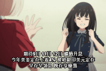 hch2006 wrote:這個月再看看有沒有3.5%的定存利率, 還有一堆美金等著存進去. 樓主有貼,你的一堆美金有去處了,我覺得九月如果定存,應該存一年鎖利率了.----------------------------7/30新增高門檻3.58%~3.88%定存的銀行匯豐美金定存優利活動下個月的公布了卓越理財戶門檻帳戶 300萬 卓越理財尊尚新戶門檻要1500萬定存最低一單 5萬美=150萬台幣----------------------------ps.匯豐卓越理財尊尚新戶之前是2000萬,現在調低成1500萬.