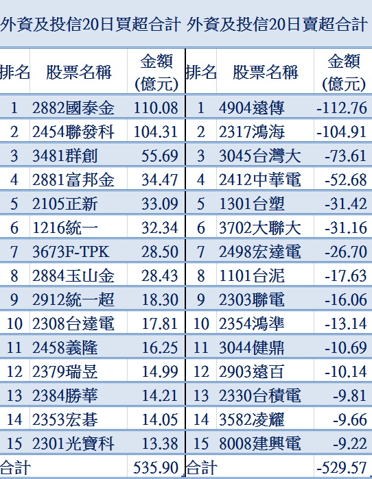 一. 排名方式:上市櫃合併排名,以金額排名,首創外資與投信合計排名
