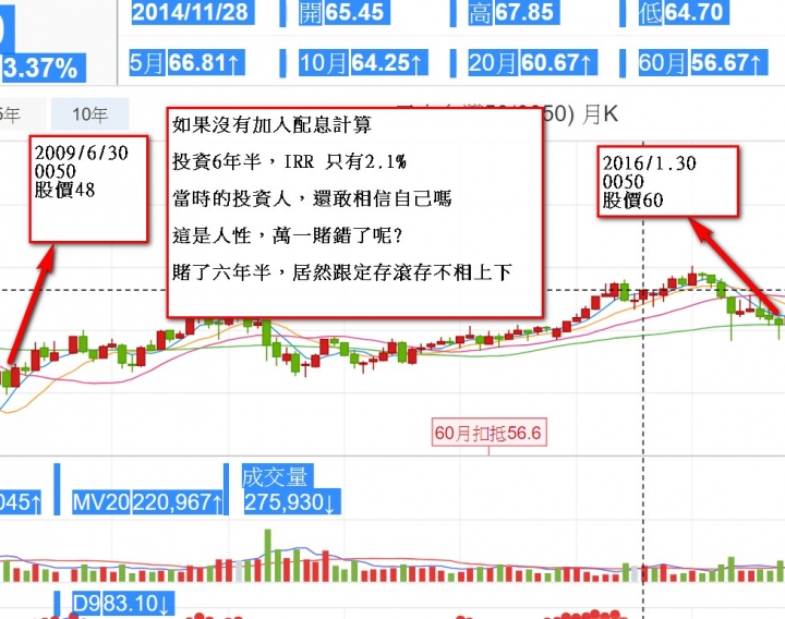 sgxm3 wrote:這是台股最近13年...(恕刪) 更正irr資訊Irr應為5.2帶入數值有誤,更正道歉這是一個事後驗證的理論,也是喜好區間選取原則的概念事後找出驗證理論的區間證明方式我改個時間假定有朋友於2009年6/30號投入0050持有六年半到2016/1/30(並假設今天就是那天)您就會發現,這麼糟糕的投資,是誰決定的長期持有理論,必須建立在,股市永遠穩定上揚的假設立論上我個人,不相信