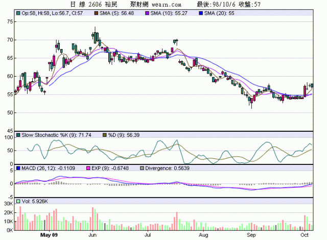 與willk兄,看的方法稍有不同,純粹討論。在個人的看法,用很久以前的價位,推估現在的目前股價是否值得。會不會時間實在是太久遠了,造成失真的現象??如果按照用95年的股價分析,那是否2606目前價位早就屬於下殺到腰斬???我認為價錢(股價)是有時間性的,以2006年與2009年來論股價誰合理,時間真的太久遠了!就像以前機車一台才4萬元,現在機車一台都要七萬元,可以說現在的機車價位不合理嗎??這兩張圖有何不一樣??上圖為W大看的型態,主要是用「月」線來分析。下圖為我看的型態,主要是用「日」線來分析。若以「月」線來看,確實屬於月線做一個M頭,做反彈修正,甚至提早做右肩下殺,應該趁機殺出以免被套??若以「日」線來看,有M頭嗎??我看成原本要成M頭被破解,最後成為盤整止跌以時間換取空間。若以日線來看現在的位置,是否可以看成頭型第二波反彈搶短??又或當成左肩型態,現階段為第一波拉高趨勢,屬於另一波的開始,甚至加碼進去??一個屬於月線型態,一個屬於日線型態,在我的看法其對未來的規劃確有很大差異(一個看空,一個看多)。我通常都僅以日線來研析型態,不以月線來研析,因為覺得用月線來看型態真的有點遙遠。個人作法喜歡順著局勢走,因為散戶的我,實在無法主導局勢,而技術分析是用來增加買進賣出的信心,以及做避險規劃。提供個人的見解。