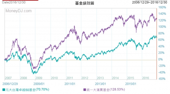n8362995 wrote:報個名牌 ...(恕刪) 截至2016/12/31止,0050十年報酬為 70.7%。下圖十年逾70.7%的(紅框),都贏。但是,過去贏不保證未來也贏。(這是一般型基金,其他型請到基智網查。)其中之一: