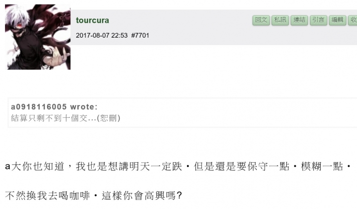 pigstand wrote:多頭來留言了。小弟現貨多單續抱,靜待12/15再平衡。(恕刪) 那是對ETF...對期權來說.那是假多頭訊號對期權來說.真正多頭訊號在今天尾盤..期現貨包含櫃買都有訊號..而美股在上周五出現疑似500點的空方訊號.但尚未完成..美股的多空決戰就在今晚((靜待訊號完成))