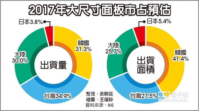 自從日本2001年成為LCD產業市佔首位後,韓國接下來16年都是液晶顯示器全球市佔率出貨最高國家,如果這份IHS MARKIT報告成真,台灣將成為2017年新霸主。