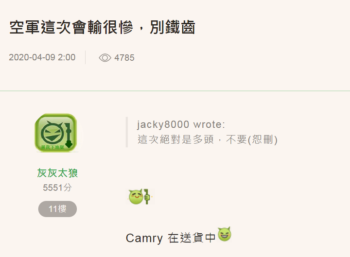 qena wrote:8K大出來喊盤了,上(恕刪) 10055▼-67 -0.66%決不吹牛灰灰太狼8851樓mflym wrote:沒漲過23400, (恕刪)又回到偶昨天起飛航線附近所以呢?已經one more night了噹噹噹814「筧橋空戰」中國空軍零傷亡完勝:日司令羞愧自殺
