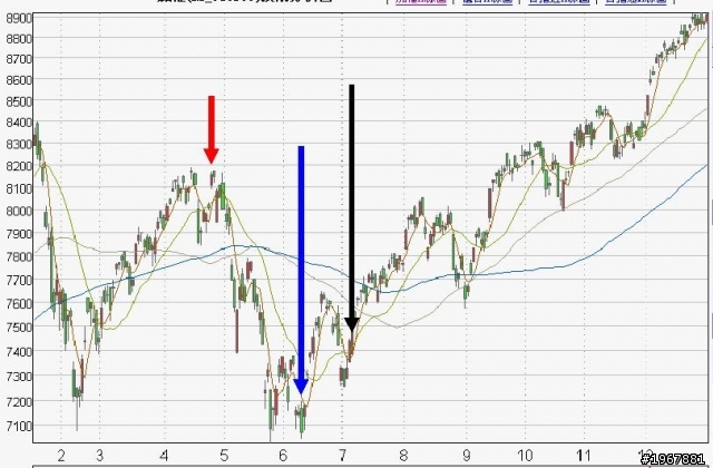 2011/4/5(藍色箭頭) 說 "經過這個禮拜的觀察,我發現一件讓我大震驚的現象,行情可能不是像我想的那樣,不是上漲波段會夭折,而是可能遠遠超過我原先規劃的點數,甚至可能一舉衝上萬點"