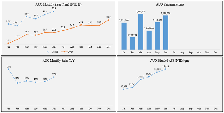 在6月電視面板仍維持小漲格局下,友達昨天公布6月合併營收339.3億元,改寫六年多來單月新高,月增5.7%,年增57.1%;第2季合併營收956.5億元,是逾六年單季新高,季增15.3%,年增50.6%。上半年合併營收1,785.9億元,年增52.4%。
