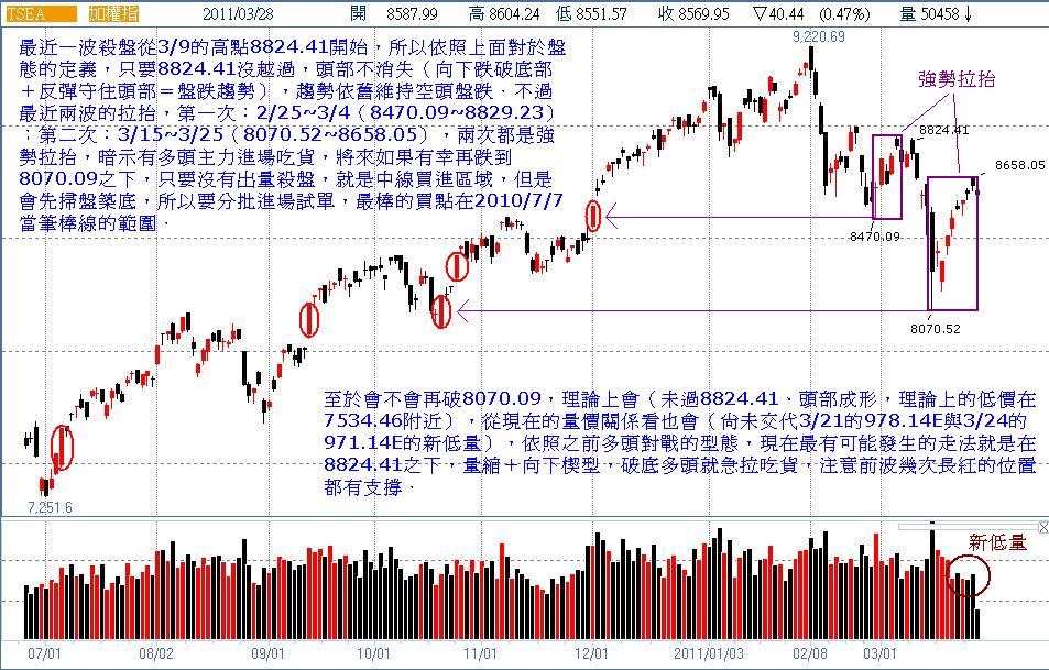 最近一波殺盤從3/9的高點8824.41開始,所以依照上面對於盤態的定義,只要8824.41沒越過,頭部不消失(向下跌破底部+反彈守住頭部=盤跌趨勢),趨勢依舊維持空頭盤跌.不過最近兩波的拉抬,第一次:2/25~3/4(8470.09~8829.23);第二次:3/15~3/25(8070.52~8658.05),兩次都是強勢拉抬,暗示有多頭主力進場吃貨,將來如果有幸再跌到8070.09之下,只要沒有出量殺盤,就是中線買進區域,但是會先掃盤築底,所以要分批進場試單,最棒的買點在2010/7/7當筆棒線的範圍.
