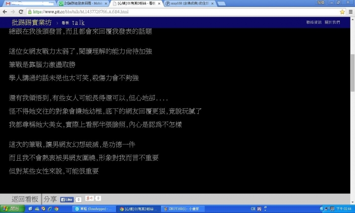 種杏栽桃擬待花 wrote:很不幸的我對他沒有興趣...光是價值觀不同 我就無法接受了 這樣也好.因為很多人從小苦慣了.就算是有錢了.也改不過來.種杏栽桃擬待花 wrote:最近對另一個男生有好感但是 他說只想當朋友而已我被打槍了 當朋友就當朋友啊.慢慢來不行嗎?又不見得一定能修成正果.加油.下一個會更好.elvila0614 wrote:大餐把酒言歡的時間...(恕刪) 不是已經在煩惱吃大餐的問題了.還叫他吃大餐?蜜小雪 wrote:拍謝啦~~大嬸我中...(恕刪) 我是X世代的.不是維基百科的資料中的X世代.您就不要自稱大嬸了.照您說的.男方也很有能力了.女方也算是慧眼識英雄了.也陪他一路苦過來.最後的結果竟然是離婚.要不要點播一首巫啟賢的歌.太傻小摩擦的累積.到一個程度而爆發.其實應該時常溝通的.了解彼此需要.以消除累積的情緒.我猜.男方應該也是蠻省的人吧.所以會為了買包包.跟岳父母住飯店的錢而爭吵.即便不是他付的錢.他也還是忍不住吧.這.還是因為錢的關係吧.錢的觀念不同.照您說來.其實兩個人當初是很愛對方的.經濟差的時候.兩人的感情應該是很好的.經濟好了.男方的觀念調不過來.即便知道花的不是男方的錢.他心裡還是會不高興的.然後一點一點地累積...男方經濟狀況跟女方差太多(女高男低的狀況).真的很難經營這份感情.男人要自尊.容易自卑.會想維護面子.要承受外界鄙視的目光.而女方.有能力.經濟強.多少有時候會造成無心的傷害.若真是走在一起.真的是不容易.朋友們很容易會說男人吃軟飯.而不會說男人娶了個能幹的妻子而感到羨慕.種種的閒言閒語都是種傷害.
