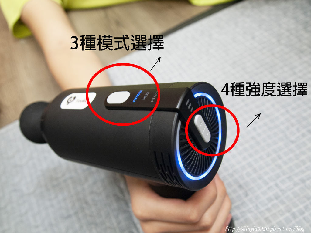 - 主機上方按鈕是3種不同模式的選擇,由低至高不同強度的轉速,剛運動完就可以選擇強度較高的模式,若平常一般按摩或是長輩可以強度低的模式,最特別的~有個從弱到強的循環摸式,這種感覺有如真人的按摩的感受