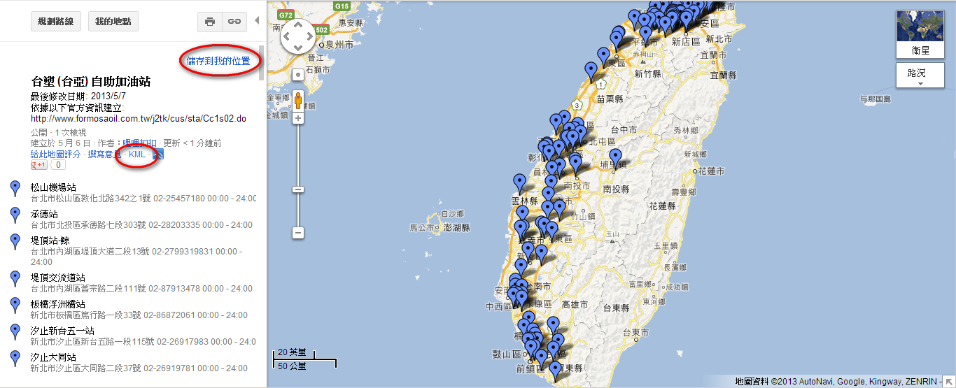 多虧了Google 地圖, 如果把所有的自助加油的站點加入到Google 地圖中, 就可以隨時隨地以Google 地圖手機應用程式, 查詢附近有無自助加油的站點了