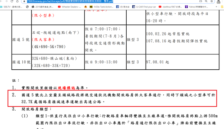 國道 5 號北上宜蘭至頭城路段將視交通狀況機動開放路肩供大客車通行,同時下頭城之小型車可於32.7K 處循路肩接減速車道駛出高速公路。https://1968.freeway.gov.tw/storage/pdf/%E5%9C%8B%E9%81%93%E5%AF%A6%E6%96%BD%E9%96%8B%E6%94%BE%E8%B7%AF%E8%82%A9%E6%8E%AA%E6%96%BD%E8%B7%AF%E6%AE%B5%E5%8F%8A%E6%99%82%E6%AE%B5%E4%B8%80%E8%A6%BD%E8%A1%A8.pdf