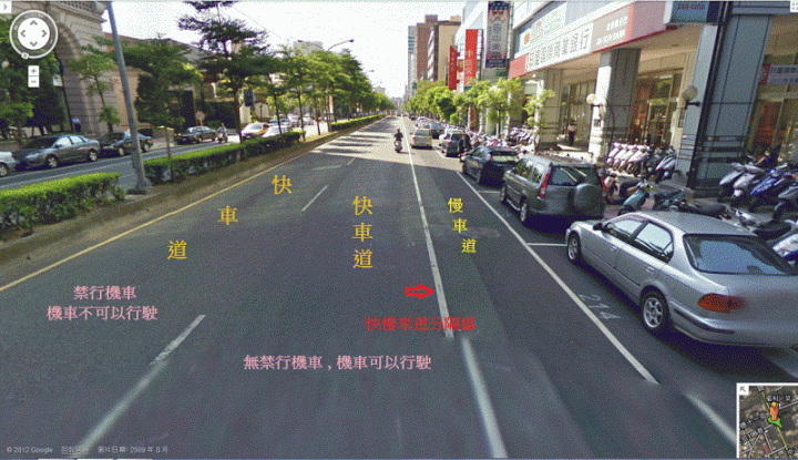 全部爬完了.......... 感覺還是很亂啊 反正總歸來說:1.三快車道2.進行機車3.兩段式左轉標誌是一定要到右方待轉 至於1.是否有標線就要待轉2.三快車道究竟有無包含特殊車道如機車專用道、公車專用道等等還是沒看到明確結論.. 弱弱的問一下...樓主照片中的道路... 算三快車道嗎!!?最外側車道不算... 看起來右邊那道很像慢車道的寬度耶...