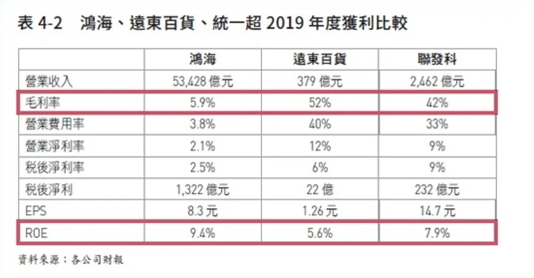 台灣有兩家聞名全球的企業,一家是名列全球前10大IC設計公司的聯發科,其毛利率大概40%左右,一年大概為股東賺進230多億元,是台灣的驕傲之一。另外一家公司是從事電子產品組裝的鴻海,鴻海以毛利率極低而備受批評,2019年的毛利率連6%都不到,但這家公司一年好歹也幫股東賺進1,300億元,ROE也比聯發科高。(ROE=股東權益報酬率)
