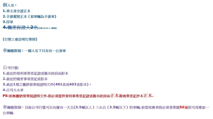 (1)須檢附有效之小型車以上駕照(若為手排車須領有手排駕照方得駕駛),且職業須為農、漁、畜牧、養殖、家庭手工藝 、木工、水泥工、油漆工、鐵工、清潔工、水電工、固定攤販、環保、推(挖)土工等行業,每人限領乙付牌照。