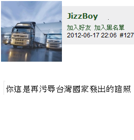 有沒有人可以把他所發過的文全部集成一本書,然後送給交通部長看一下啊?到底是哪個白痴豬頭發駕照給這種人啊?超級自我感覺良好+超級厚臉皮樹若無皮、必死無疑!人若無皮、天下無敵!果然用在這種人身上是再適合不過的形容!