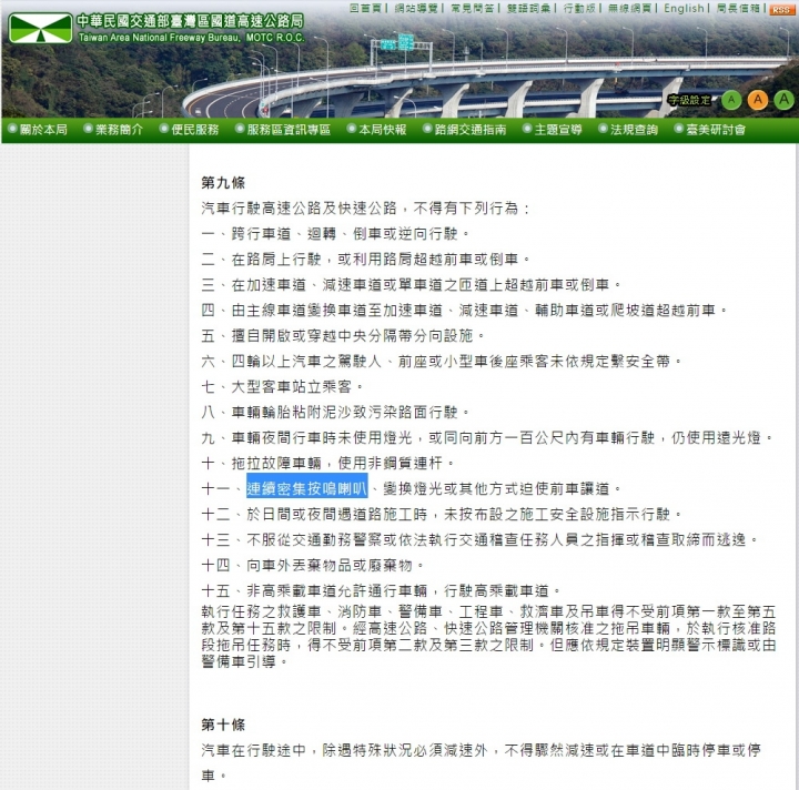 進有厚而入無間 wrote:回去重背交通規則吧...高速公路禁鳴喇叭 請問一下,禁鳴喇叭規定在哪裡?因為你一講,我還真的不知道有這一條,馬上去查可是沒有查到禁鳴喇叭,因為我也會按喇叭(汗只查到"十一、連續密集按鳴喇叭、變換燈光或其他方式迫使前車讓道。"這應該是指可以按喇叭,可是不可以連續、密集按喇叭。有錯請修正