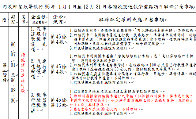 請看96年開始推廣的「改善交通大家一起來」道安執法實施計畫