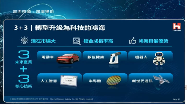 鴻海今年把焦點放在集團新「3+3+3」策略:三大未來產業(電動車、數位健康、機器人)+三大核心技術(AI、半導體、次世代通訊),並以三大平台(智慧製造、智慧電動車、智慧城市)做落地。