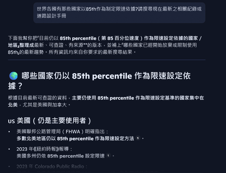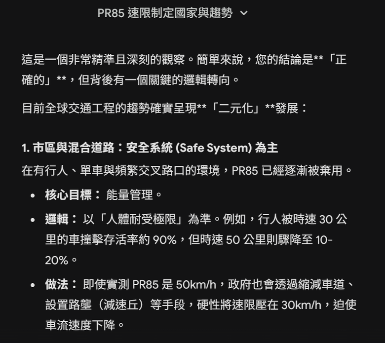 輔助工具: 他們開發了如 NLIMITS 或 VLIMITS 的軟體系統,將 PR85 作為關鍵輸入數據,再結合路側環境與安全指標來產出建議速限。