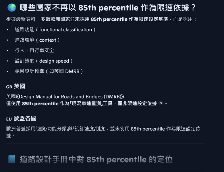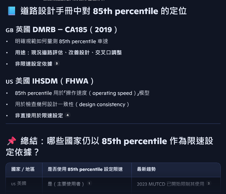 英國: 過去曾廣泛參考,但現行方針(如 DfT 指引)更強調「證據導向」,會同時考量事故史、行人活動及 PR85 測量值。