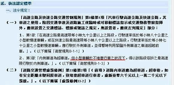 內側車道為超車道。但小型車輛於不堵塞行車之狀況下,得以該路段容許之最高速限行駛於內側車道