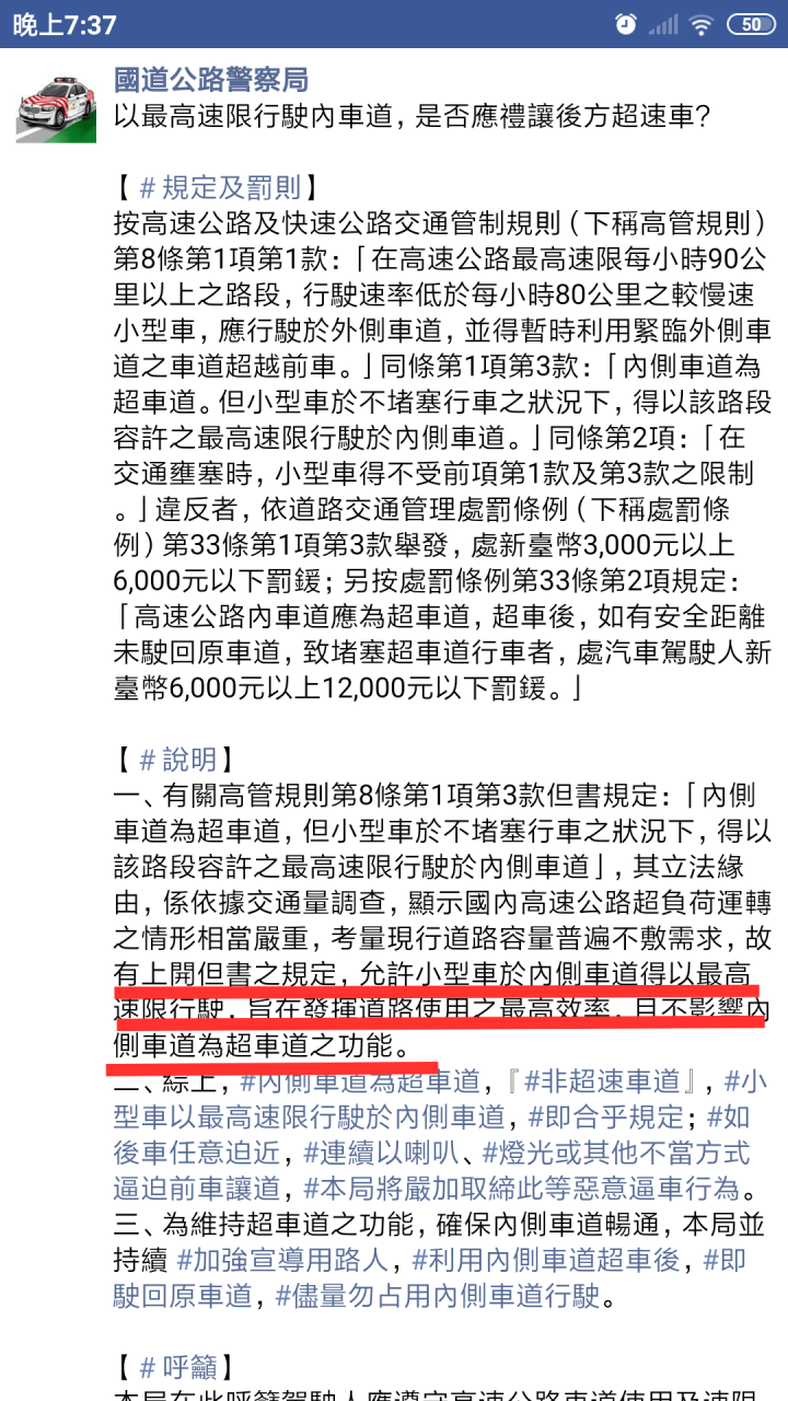 Gullit168 wrote:A車依"法+無罪推定...(恕刪) 對,警察執法是這樣卻不是高公局和國道警察的宣導的本意被後車追上仍不讓道就失去超車道的功用這也是為什麼高公局與國道警察一直強調內線車道為超車道但書允許是讓你方便但前提還是不堵塞行車以及不影響超車道功能