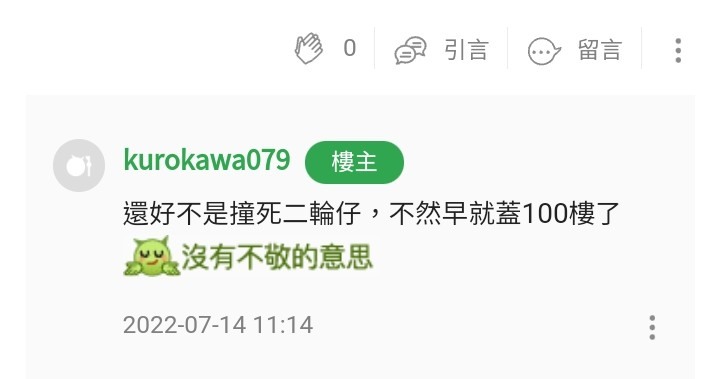 kurokawa079 wrote:新聞新北市深坑區一輛(恕刪) 個人為求保命~或是避免斷腿截肢~全家老小~早就養成各種匪夷所思的良好習慣~等公車時~有騎樓的~絕對要躲在騎樓的柱子後面~沒有騎樓的~就找別的地方躲~看到公車來再出來~有公車站棚的~絕對要躲在公車站棚的後面(最好是柱子附近)~公車棚(或其柱子)看似不堅固~同樣去找別的地方躲~看到公車來再出來~等綠燈過馬路時~概念同上~不只市區/鄉下地方/郊區/省道旁...都是一樣~路上危險炸彈太多~(飆車/酒駕/毒駕/三寶/撿東西/看手機/吃安眠藥...的...)(車子有問題不修/不戴眼鏡/腳麻/手抖/穿鳥鞋/打瞌睡/老扣扣...的...)這些人會不定時/不定點出現~滿街都有~遍及全台~還是要小心為上~免得死的冤枉~
