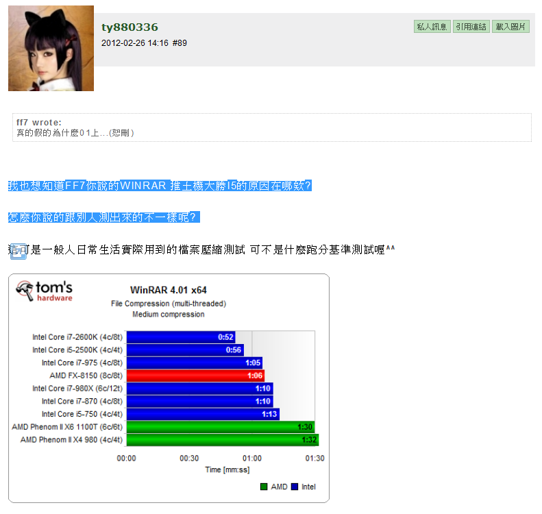 3.閣下"順便測試處理器及將結果分享的立意"當然並無不妥..但既是使用"回覆"功能所發的討論內容卻又偏離發文者的主題,完全自說自話.等於占用該討論串回應版面發表文章的做法..就顯得不怎麼合適了(恕刪)