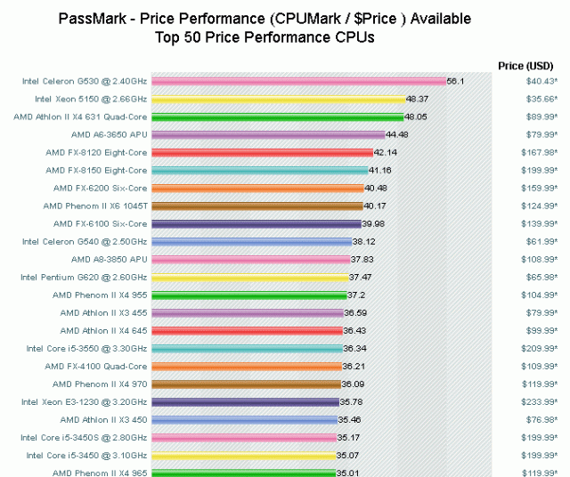 VQ35COREi7 wrote:由此可見最有CP值的是: G530給他拍拍手這個玩笑好不好笑阿 這個早就有人作好了. Intel AMD 放一起比Performance base, 非單純核心x時脈(不過是以 CPU 單體為基礎. 用整機來算會不一樣)http://www.cpubenchmark.net/cpu_value_available.html