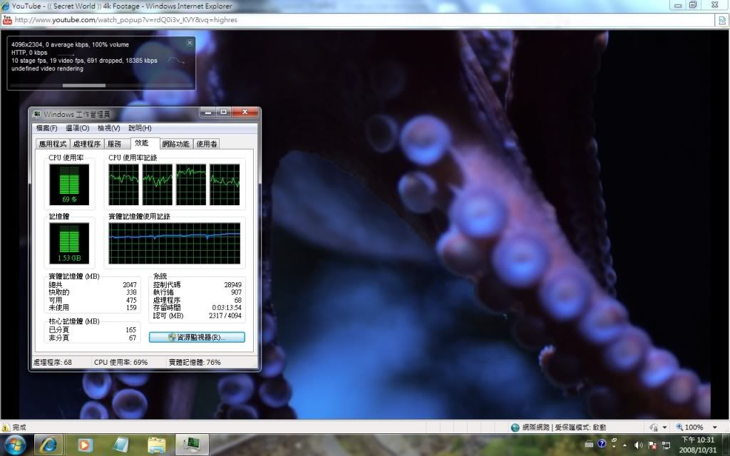 一、首先抱歉,小弟過去不知道YOUTUBE上會有這種碼率在20-30MBPS的影片,誤以為都是藍光片以X.264壓縮的非純正1080P影片。二、其次,14、15樓的朋友,謝謝您們,不過您提供的片子並非高流量的片子,BDRIP後的藍光影片,對電腦的考驗並不難。我發文的困惑是針對20-30MBPS流量、甚至40MBPS流量的影片。三、請問:(1)誠實的肉團大大所PO的4K影片(以original開啟)、(2)20樓樓友提供的2010台北101煙火、(3)百事達出租的藍光原盤,如鋼鐵人(IRON MAN )三者相比,何者的碼率流量較高?因為小弟只知道過去我的AMD5200跑一般藍光原盤時CPU工作率在70%-95%之間,想要有個比較基準,謝謝。