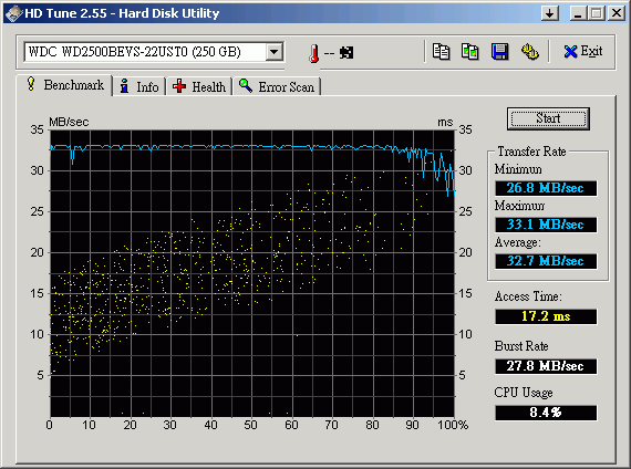 PChome 訂的 ACER HD-D15 250GB 今天到了,盒子裡面蠻寒酸的,除了產品主要本體外,只有 Y 型線和包包。沒有任何光碟、說明書、保證書。看在產地 MIT 和 WD 硬碟就先不 care 了。一拆開來就接上 PC 試,用 HD Tune 免錢版測試如下: