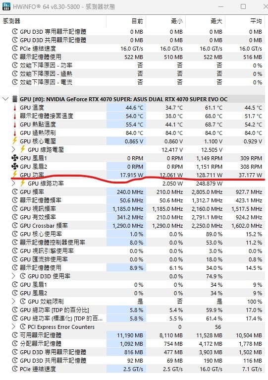 看待機功耗比較沒必要, 跟CPU一樣, 即使滑鼠都不動, 背景程式有沒有作動都會跳動最重要還是它在執行喜愛的遊戲時, 有沒有跑滿應有的功耗, 有沒有順暢比較重要比較常用HWiNFO, 清楚明瞭同是4070 SUPER供參待機最低12W執行NBA23 128W