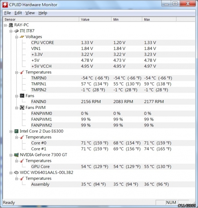 個人的CPU E6850搭GIGA P35-DQ6開節能平常2GHZ跑--->1.09V給他操下去100%變3GHZ跑--->1.3V操下去溫度才會到你的溫5X度....我破更大....16%多CPU散熱器(原廠的嗎?)真的有清乾淨嗎?還是沒裝好...???GPU的溫度...但舊卡不知這樣算不算有點偏高???硬碟溫度算OK