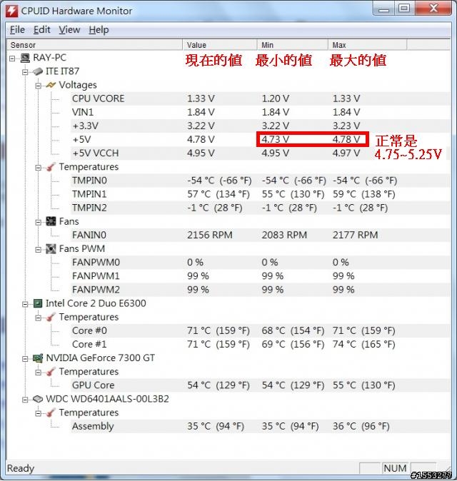 跟 5V無關....CPU供電模組吃的是 12V的電.....跟軟體也無關......哪一套監控軟體都一樣....都是去讀取主機板的硬體監控資料.....你如果想看最正確的讀數.....去BIOS看.....或是用主機板官方的監控程式看....但是.....如果主機板本身的電壓偵測硬體部份出問題....怎麼辦? 你認為軟體可以超越硬體獨出正確的數字嗎??你的散熱器會燙手.....CPU明顯溫度過高......風扇轉速是否正常? 散熱片有無嚴重積塵? 這兩個都沒問題的話....只能先假設 CPU正常.....從 CPU電壓著手進 BIOS內將 CPU核心電壓調低 0.2V試試