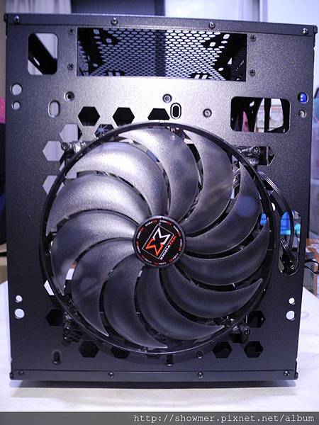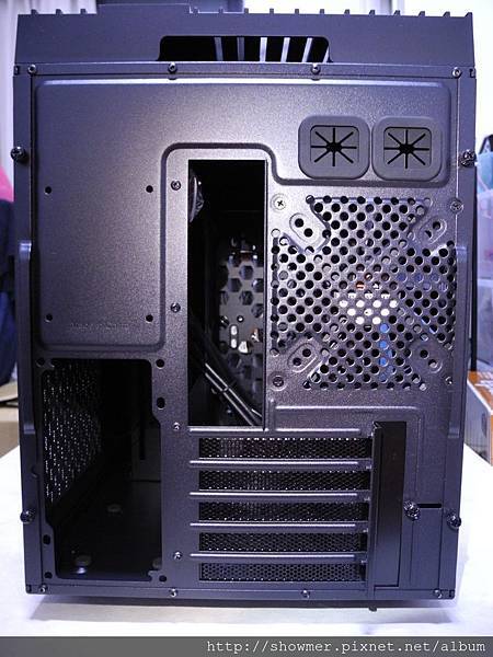 後方背板,可以看到預設的120mm風扇,以及預留的水冷管路出入口,左上方的螺絲孔就是用來安裝2.5” SSD的