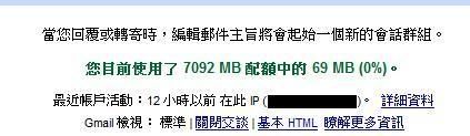 cookiess46 wrote:一早起來,收個信,發...(恕刪) 很久沒用容量也暴增從 Yahoo、Outlook 和其他服務匯入通訊錄到 Gmail 通訊錄。 更多資訊您目前使用了 7097 MB 配額中的 0 MB (0%)。最近帳戶活動:7月11日 在 IP 61.218.85.148。 詳細資料Gmail 檢視: 標準 | 關閉交談 | 基本 HTML 瞭解更多資訊©2008 Google - 條款 - Google 首