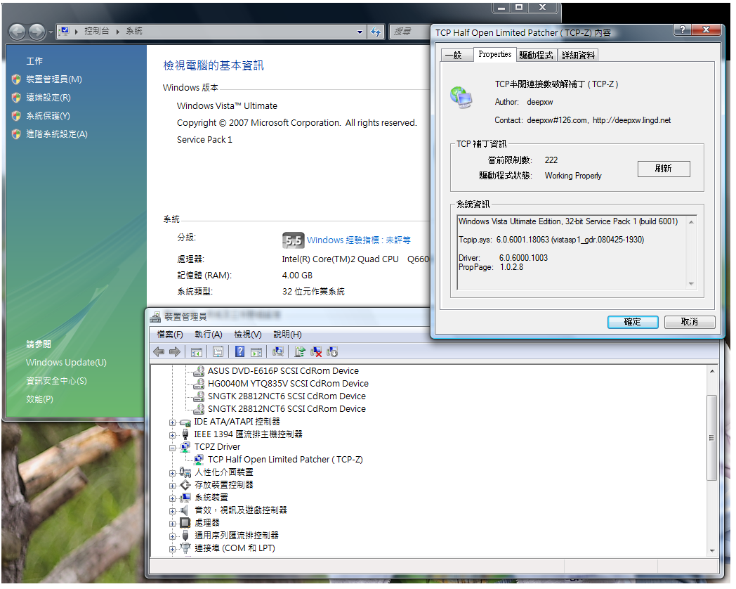 連線數有問題+1 (我自己也覺得很有可能是這個問題)po張圖請大大們看一下,這樣算不算是破解連線數了?這破解是小弟安裝VISTA後就馬上安裝的,如果上圖是已破解的情形,那目前不能開啟網頁似乎與破解連線數無關。或是....之前的VISTA更新,又把連線數改回原本的VISTA預設值??那小弟再用此程式破解一次即可?請大大們賜教,感謝!