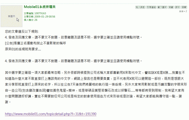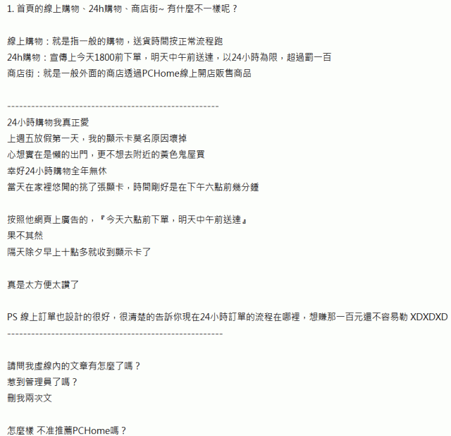 keigowei wrote:可以請問01管理員是...(恕刪) 仔細看了看... 他有提到刪除的原因啊...也許您自己叫習慣了,沒注意到...問題不在標點符號,也不在推薦 pchome...而是在您提到你家附近「燦坤」的那一句吧!?--不過,我覺得這個應該抓不完... 太多人習慣這些用語了。不知道站方是不是有甚麼壓力或困擾?還是說想導正風氣?把精神花在這上面,還真是吃力不討好的工作。