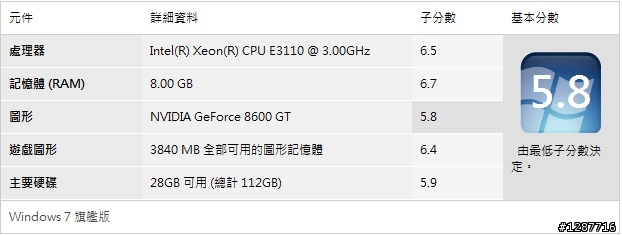 ....................我知有7.3而已...........32位元.cpu: Q9550MB: P5Q-EDDR2 4gHDD :SSD*1 G2DVD-RWVGA :gtx 285 1G大致上就這樣.....其他不打了.這樣算高嗎? 試灌跑跑看.......改天再調效一下看看.......蛙!!!........哪位大大........7.9耶!......