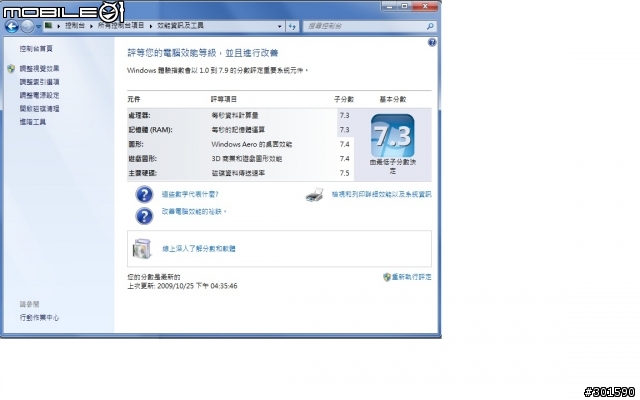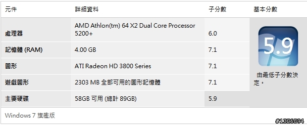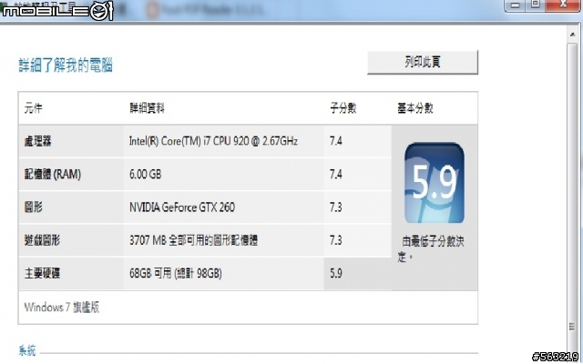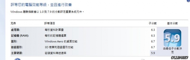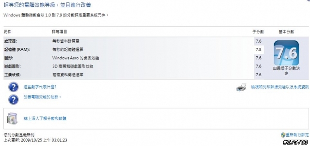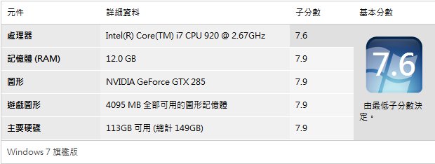 不知道有沒有大大體驗指數是7.9的....=.=" 還是要等6核心出來....小弟的...Windows 7 64位元旗艦版CPU: i7-920 OC 3.2GRAM: DDR3 12GMB: ASUS P6T-V2VGA: ATI 4890HD: OCZ SSD 60G x2 跑RAID0