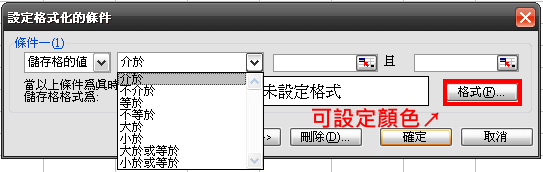 選取要變色的儲存格→格式→設定格式化的條件→如圖