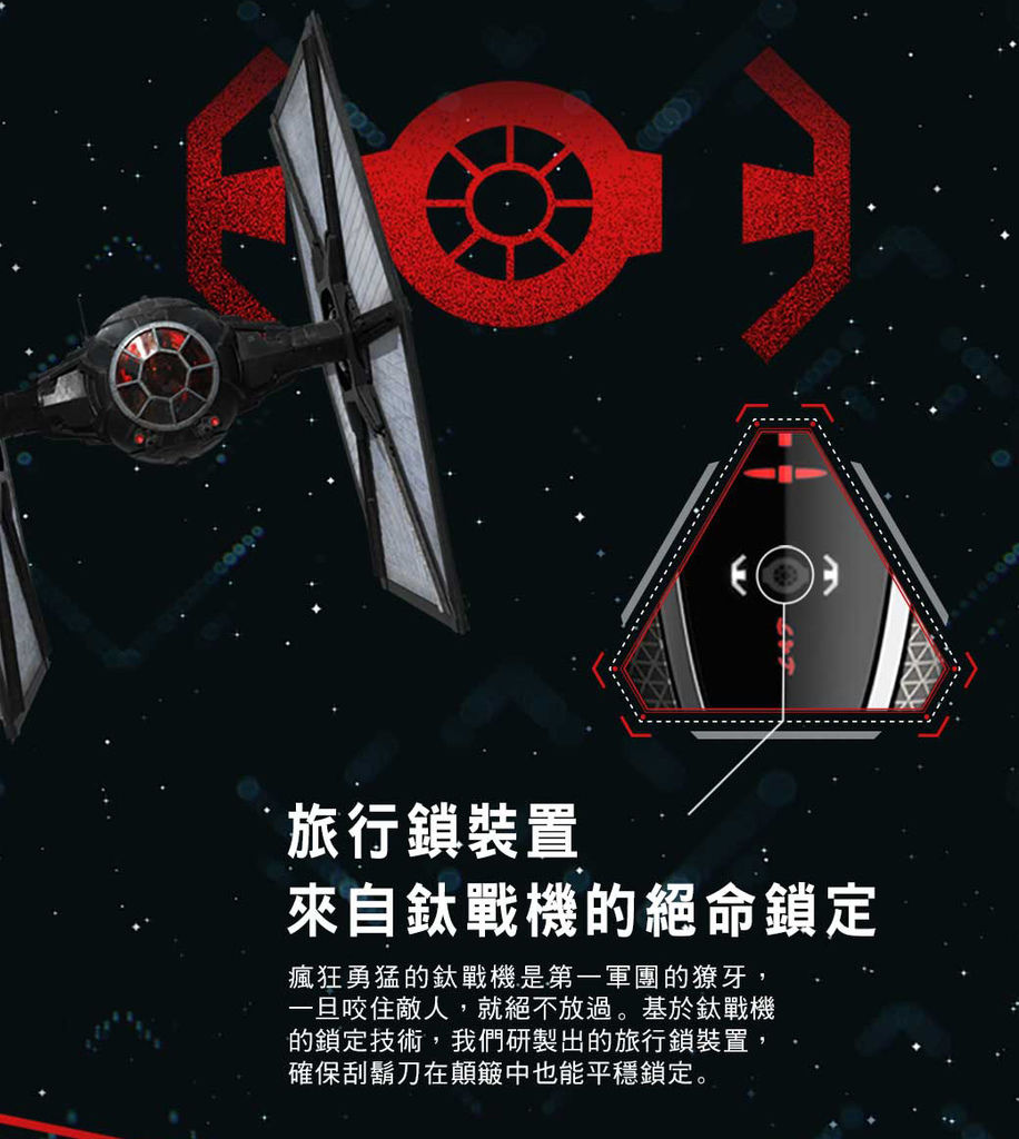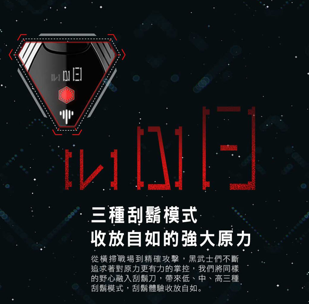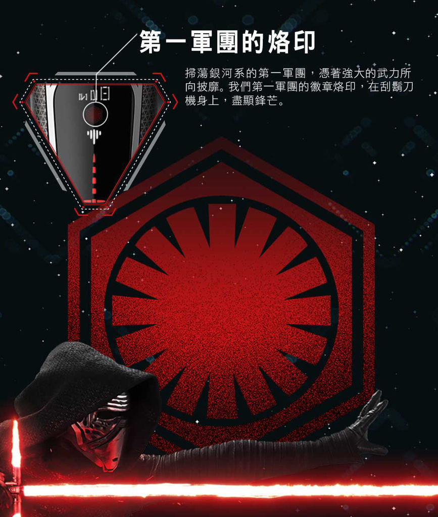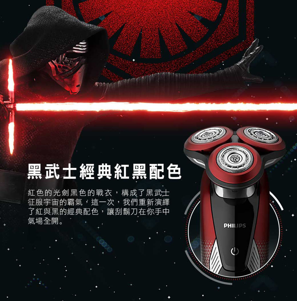 經典的紅黑配色,如同黑武士一般,紅色的光劍搭配神秘的黑色戰袍,套用在電鬍刀的外型設計裡,讓人印象深刻且吸睛。