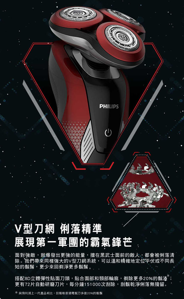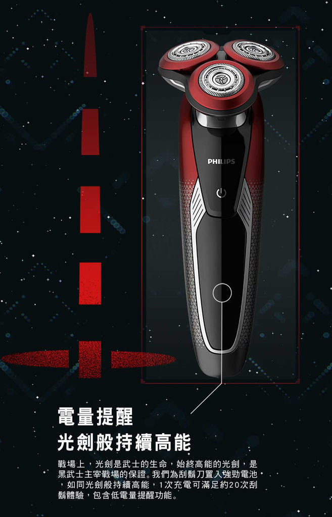 星際大戰風靡全球40餘年,可以說是橫跨世代的經典,隨著六部曲電影的上檔,然後近年來前傳電影的拍攝,每一次都能帶領全球的星戰迷引發一陣狂熱!沒想到,2018年的夏天,全球電鬍刀領導品牌飛利浦居然跟星際大戰電影聯名推出了這款超級酷炫的「飛利浦PHILIPS星戰系列 第一軍團 Star Wars電鬍刀(SW9700)」!這台新款式的電動刮鬍刀用上了三刀頭和8D立體貼面,能服貼的刮乾淨鬍鬚,和過往往復式的老式刮鬍刀的體驗有極大的差異和提昇,過去使用往複式電鬍刀,使用2~5年刀網就會破損,破損後如勉強刮鬍,就會造成刮傷流血的情況,而三刀頭旋轉式則改良了往復式的缺點,刀網邊緣拱形結構下, 可將拱頂負載的重量, 平均傳遞、分散到兩側,有效加強刀網的堅固與耐用性!